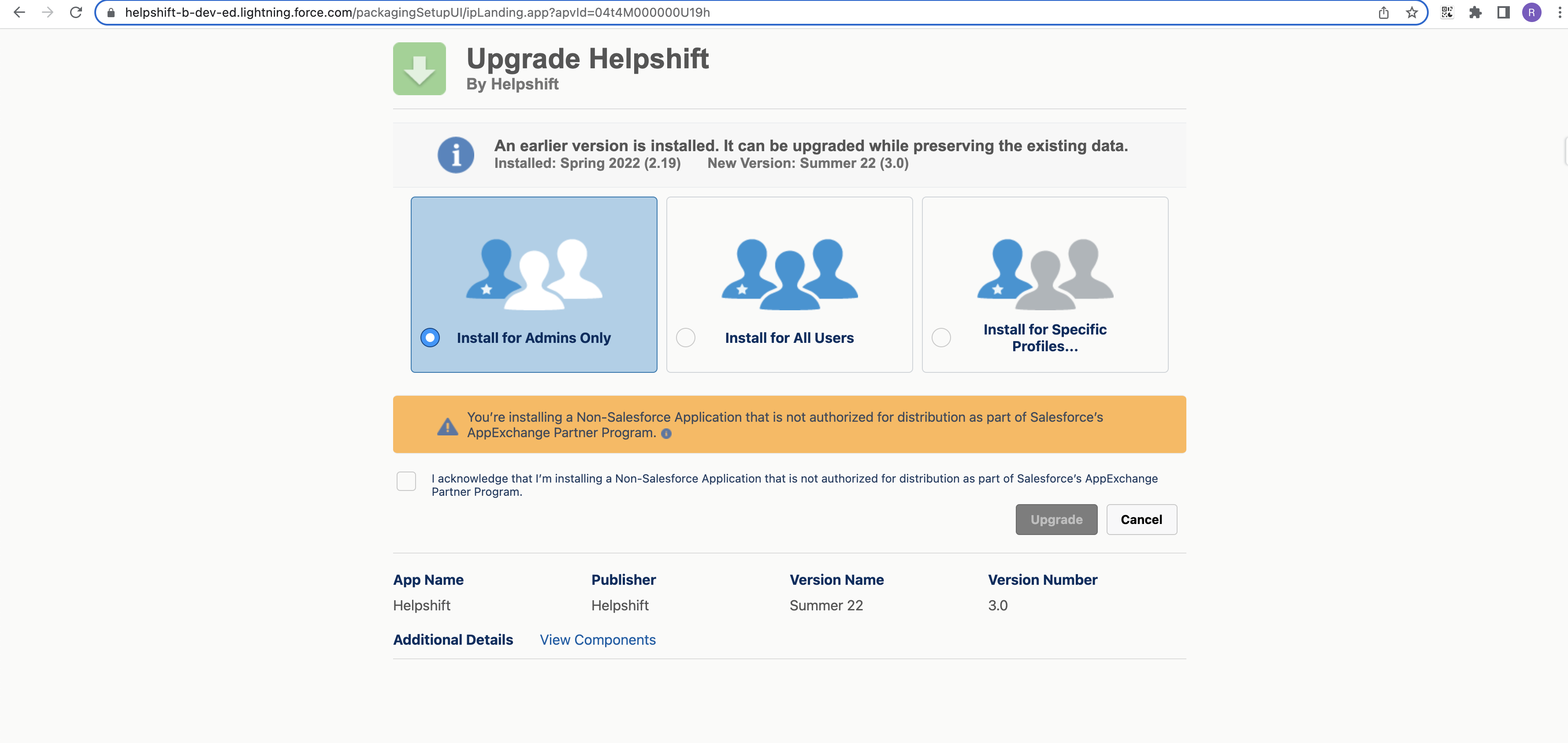 - The upgrade page would show the current version and the new version. In the above image, the current version is 2.19.