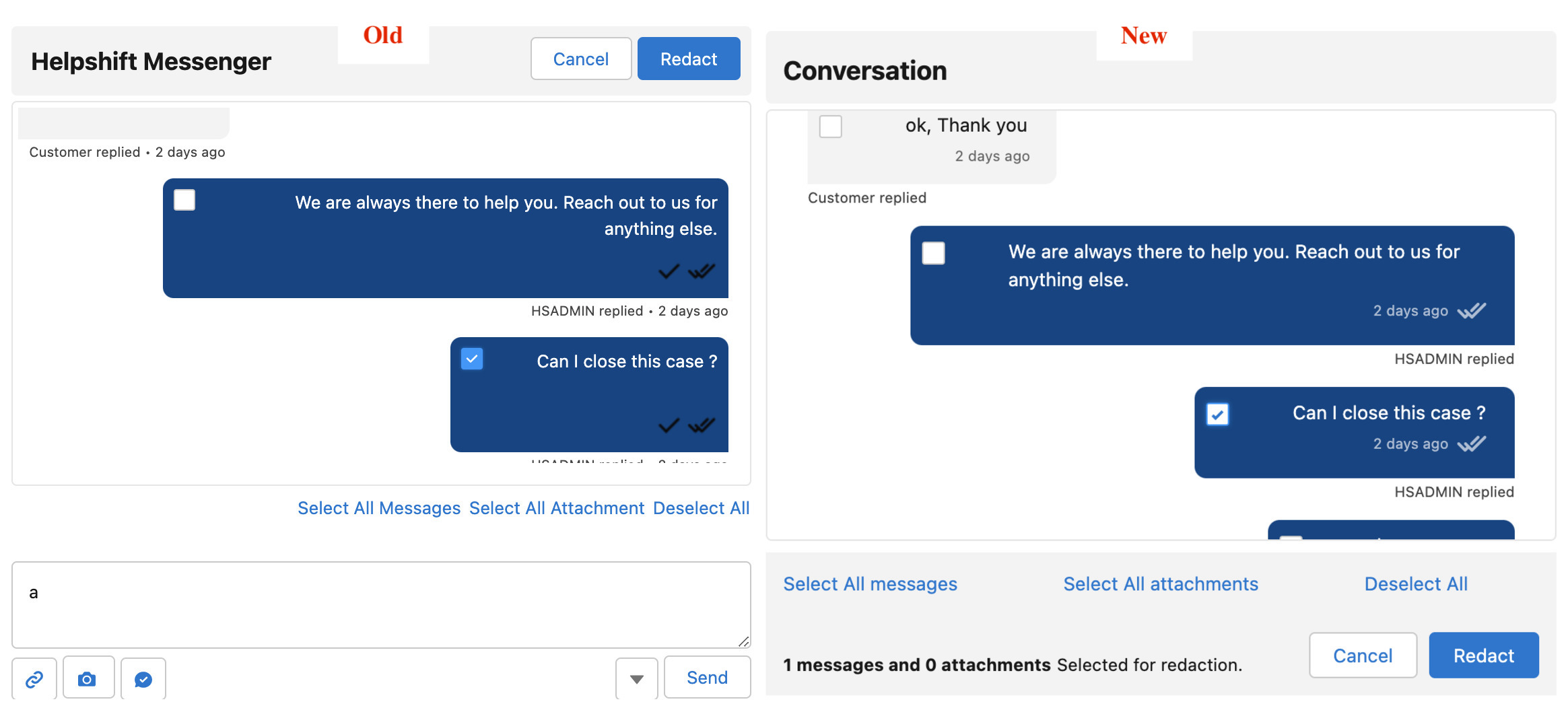 - The old experience will be available too. If the new messenger or any admin functionality doesn’t work as per your expectations, or you do not like the new experience, you can switch back to the old experience. Please provide feedback to Helpshift Support on reasons to switch back.