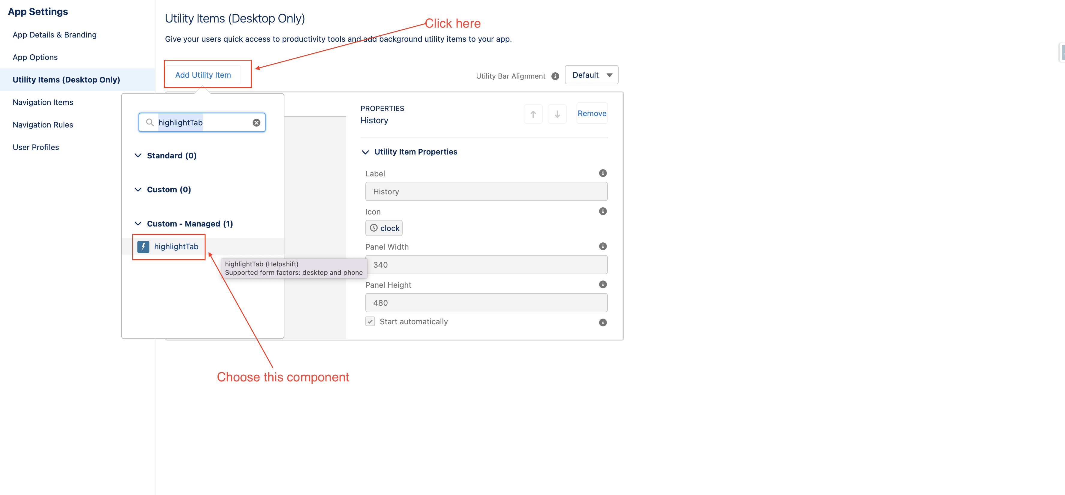 - Click on Add Utility Item and search for highlightTab :